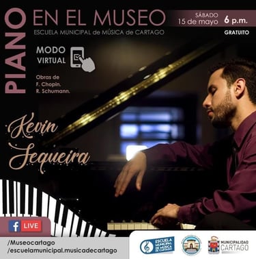 Kevin Sequeira ofrecerá un recital con música de compositores los compositores F. Chopin y R. Schumann dentro del ciclo de conciertos de la Escuela Municipal de Cartago (EMMC), Costa Rica.